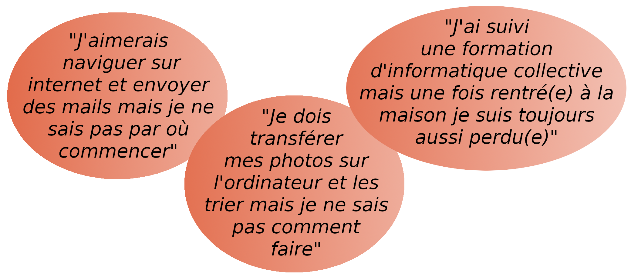 Vous n’y connaissez rien à l’informatique? Vous avez quelques bases mais vous n’êtes pas à l’aise avec un ordinateur? Vous ne savez pas comment transférer vos photos du téléphone vers l’ordinateur? Vous aimeriez trier vos photos ou autres documents dans des dossiers? Vous êtes perdu sur internet ou vous avez peur de vous faire arnaquer? Vous devez faire des démarches sur Ameli ou Doctolib?